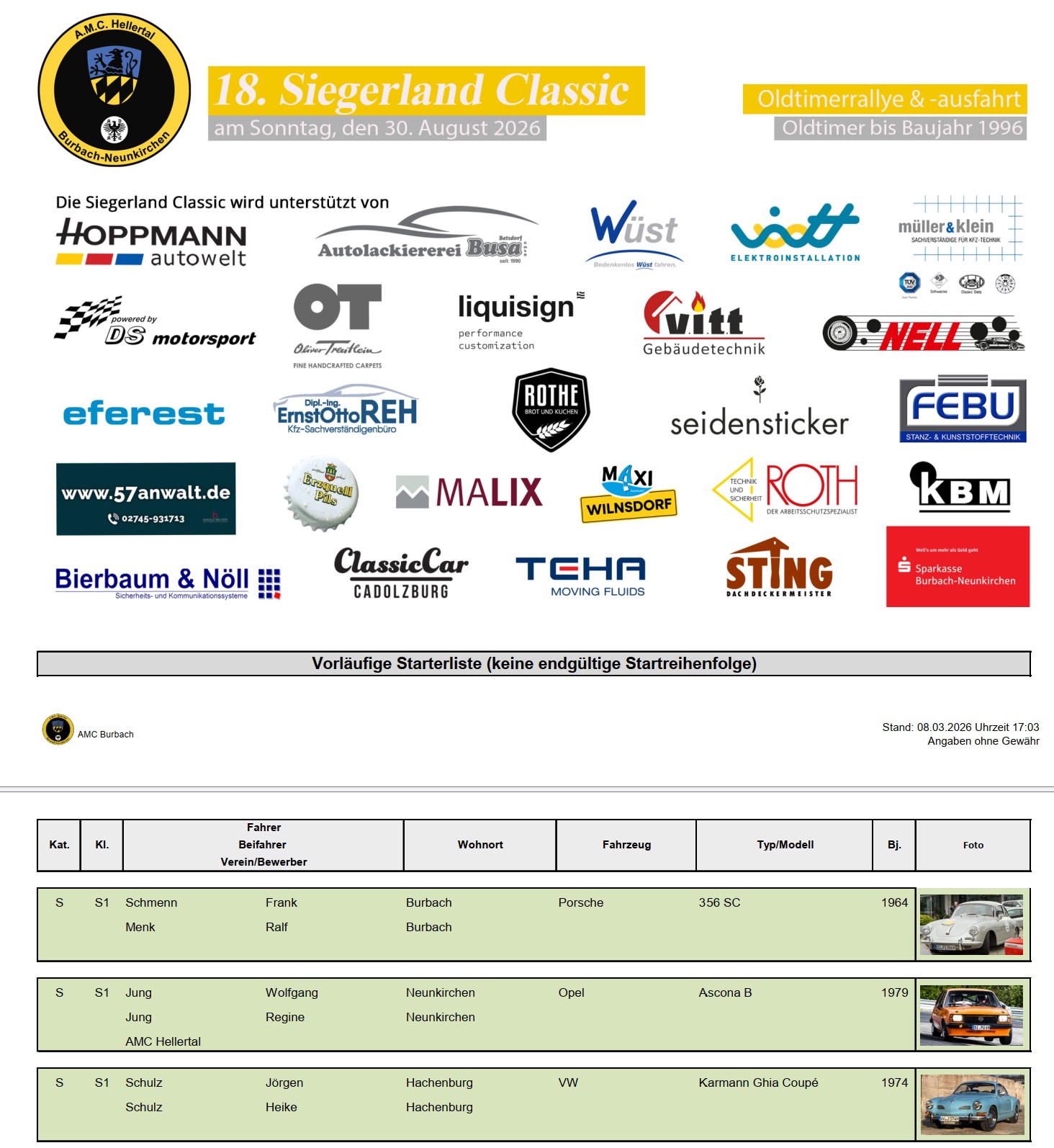 Noch knapp 6 sind es, bis Ende August für die rund 110 Oldtimer bereits zum 18. Mal die Startflagge zur Siegerland Classic auf dem Gelände des Maxi Autohofs in Wilnsdorf fallen wird. Unsere vorläufige Starterliste zeigt Ihnen, wer bei der beliebten Oldtimerrallye im südlichen Siegerland dabei ist.